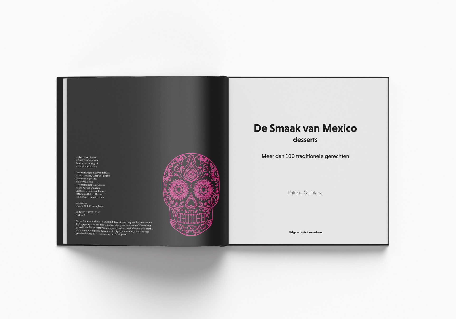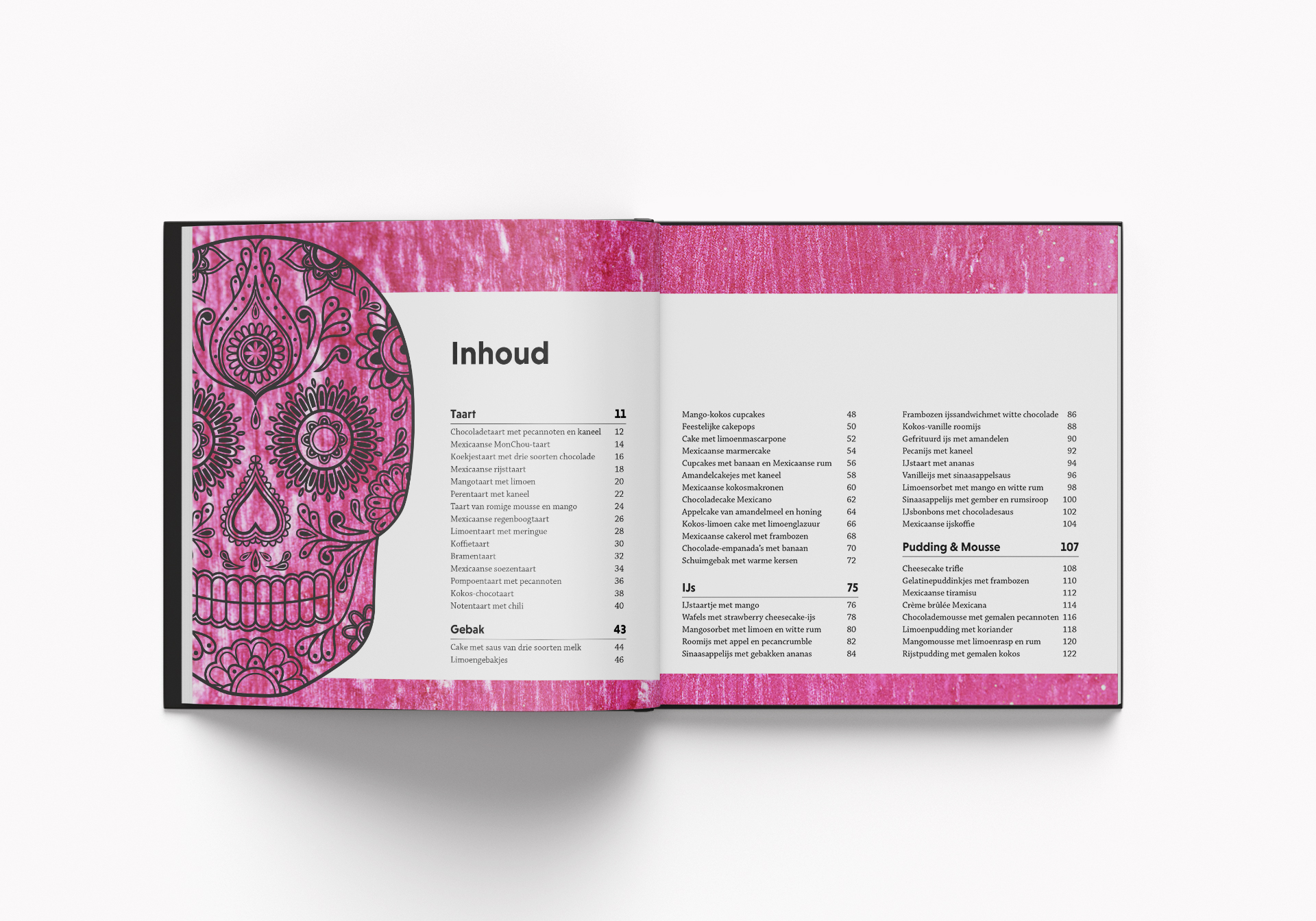 Ik heb gekozen voor een kleurige stijl gecombineerd met zwart. Het gebruik van de sierlijke schedel is een knipoog naar het Mexicaanse festival Dag van de Doden.